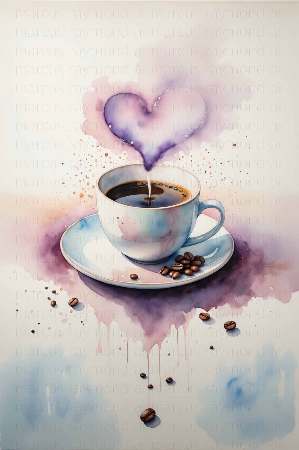 Discover the perfect blend of artistry and coziness with this captivating royalty-free image showcasing a beautifully illustrated coffee cup, filled with rich, dark coffee, resting gracefully on a matching saucer. Above the cup, a whimsical heart-shaped splash of soft purple and pink watercolours evokes feelings of warmth and affection, making this artwork a celebration of both love and coffee.