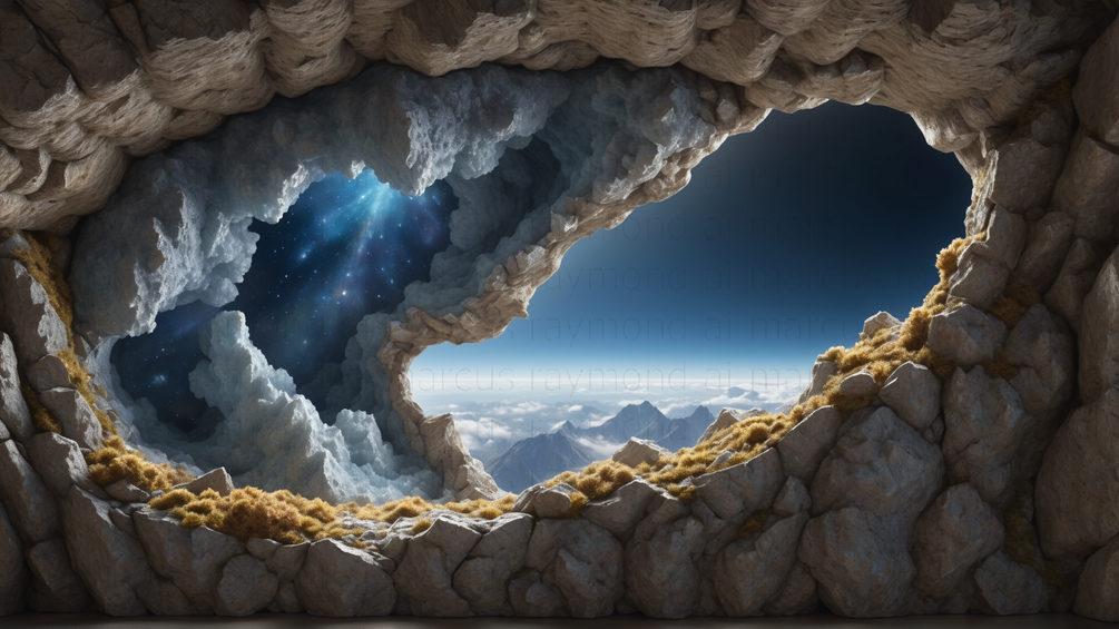 Unlock a gateway to the cosmos with this royalty-free, high-resolution image capturing a mesmerizing landscape framed by rugged, golden moss-covered rocks. Through this natural archway, a breathtaking starry sky reveals a celestial expanse, shimmering with distant galaxies and twinkling stars. The sky’s gradient, from deep midnight blue to soft twilight hues, enhances the sense of wonder and exploration. The combination of textured earth and ethereal sky offers a visual balance between the grounded and the infinite.