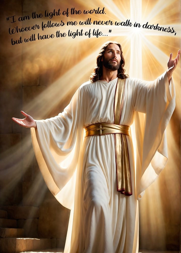 Discover the profound beauty and timeless inspiration of these 2 royalty-free artworks depicting Jesus Christ following His resurrection. One of these images contains our chosen scripture and the second image is simply a blank canvas with Jesus without for your own editing purposes, these high-quality images capture Him in a flowing white robe with a gold sash, radiating divinity and serenity as soft beams of light create a luminous halo effect behind Him. His arms are extended in a gesture of openness and welcome, evoking powerful feelings of hope, faith, and transcendence.