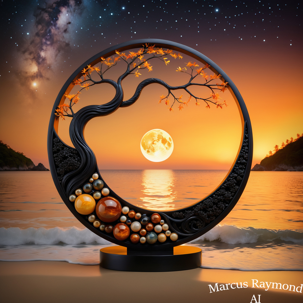 Unleash the harmony of art and nature with the Yin Yang Tree Sculpture Collection, featuring 2 high-resolution, royalty-free images in a striking 1:1 square format. These meticulously crafted images showcase a large, intricately designed Yin Yang-themed tree sculpture crowned with a luminous moon at its center. Adorned with delicate beads, this artwork radiates balance and serenity. Set against a sandy beach backdrop with smaller trees scattered in the distance, the composition exudes a tranquil yet captivating aesthetic.