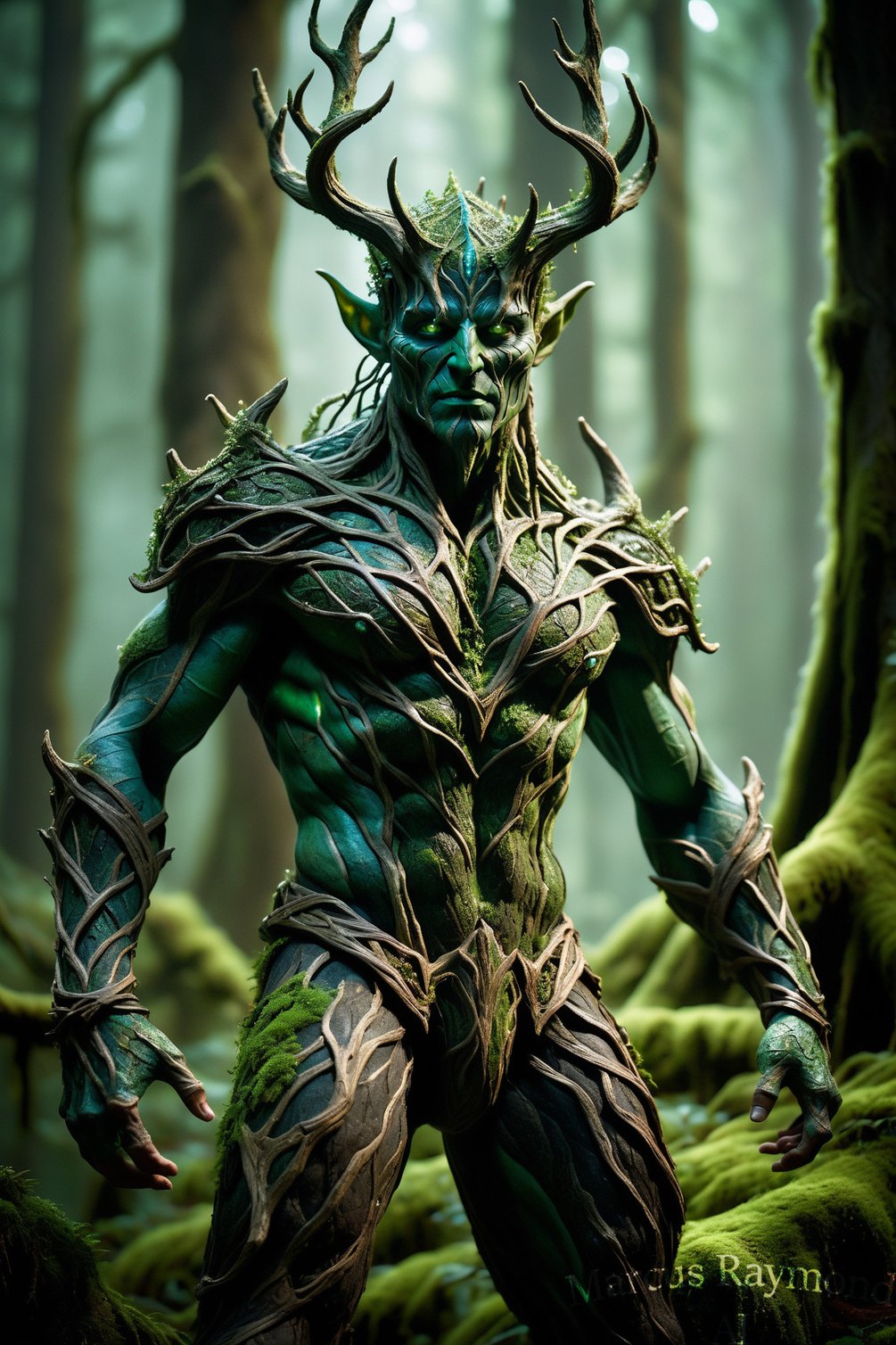 Step into an enchanting world of fantasy with this mesmerizing depiction of a Spriggan—a mystical creature blending human and plant-like features. With its striking green body, moss-like chest growth, and distinctive horns, the Spriggan radiates an aura of mystery and connection to nature. Set amidst a lush forest, the image captures a harmonious balance between the creature and its verdant surroundings, creating a spellbinding visual narrative.