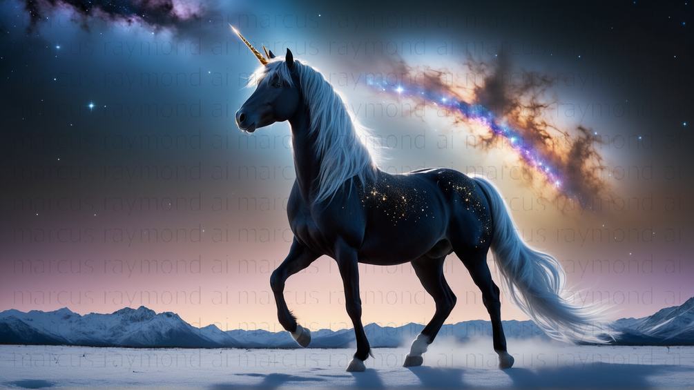 Transport yourself into a dreamscape with “Cosmic Unicorn Fantasy Art,” an ethereal royalty-free digital masterpiece. This enchanting image portrays a majestic black unicorn, its lustrous mane flowing as its celestial horn gleams under a cosmic sky teeming with swirling galaxies. Sparkling like stardust, the unicorn stands in serene contrast to the rugged, snow-capped mountains that stretch across the background.