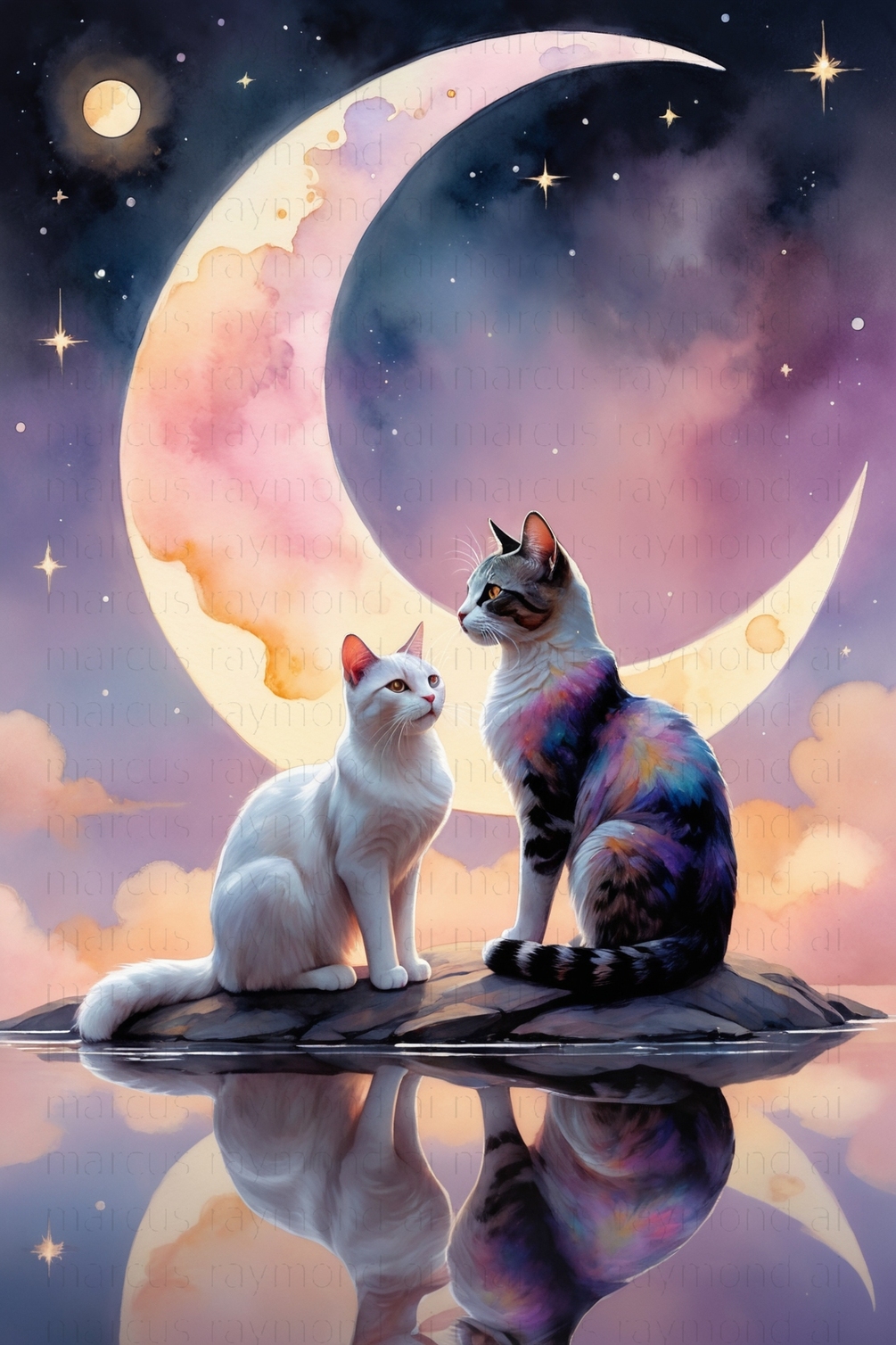 The vibrant sky transitions seamlessly from deep blues to vivid pink and purple hues, dotted with sparkling stars and wispy clouds, creating a dreamlike atmosphere. Below, the tranquil water reflects the moon’s glow and the feline figures, adding depth and harmony to the composition. This 300 DPI masterpiece measures 2309 x 3464 pixels, with a rich 24-bit color depth for vivid, lifelike detail, perfect for a variety of uses.