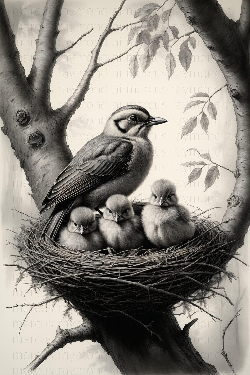 Experience the timeless elegance of these 3 stunning black-and-white charcoal illustrations capturing a tender moment of a bird with its young in a nest. This artwork includes two portrait formats and a square image, offering versatility to suit your creative or decorative needs. Meticulously crafted with intricate details, the illustration evokes both warmth and sophistication, making it perfect for a variety of uses.