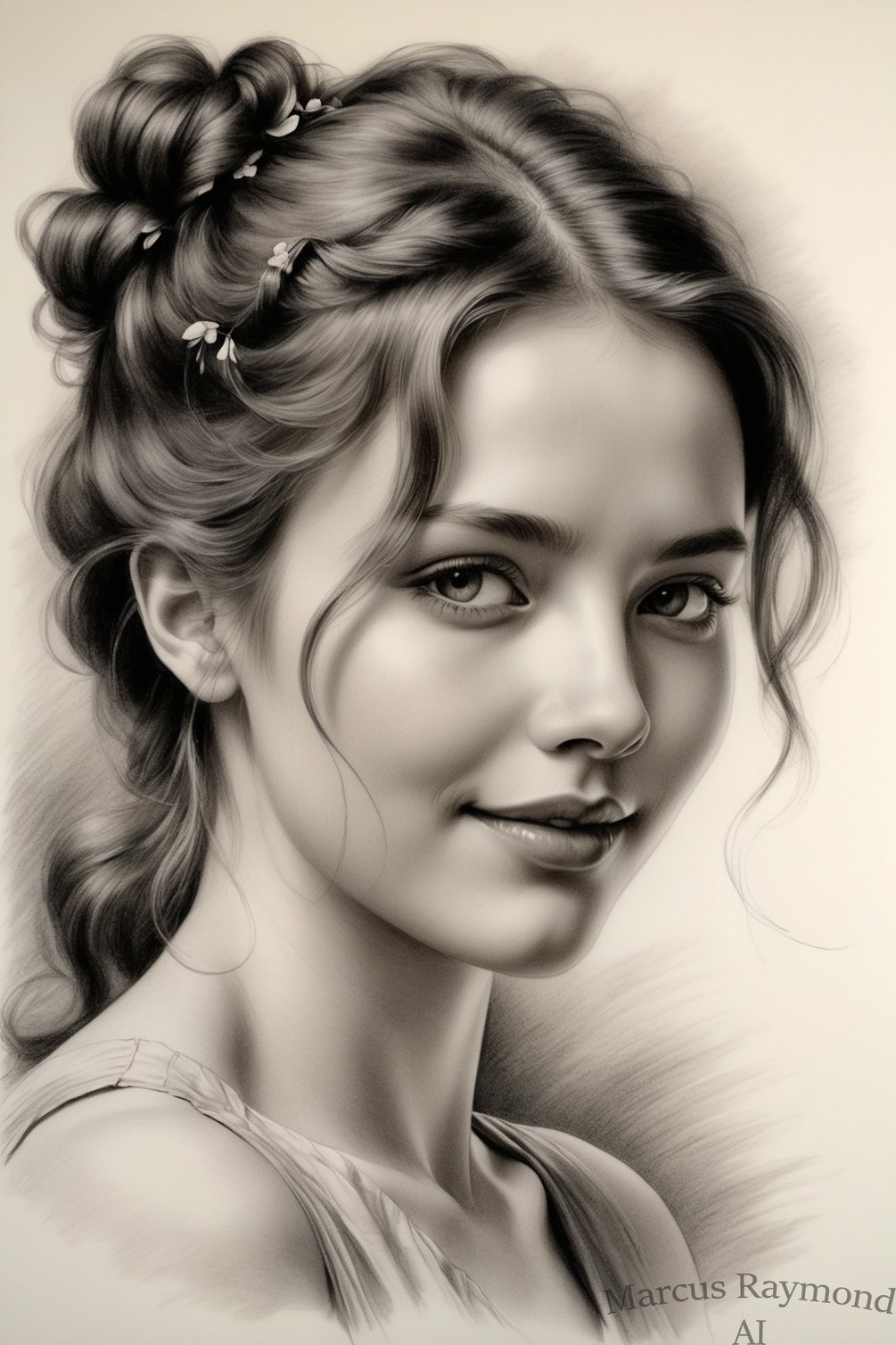 Capture timeless beauty with this elegant charcoal portrait. This royalty-free artwork features a stunning close-up of a woman with long, curly hair and a captivating smile, her expressive eyes exuding curiosity and charm. Rendered in exquisite detail, this charcoal masterpiece is a blend of classic artistry and contemporary allure, making it a versatile addition to your creative toolkit.