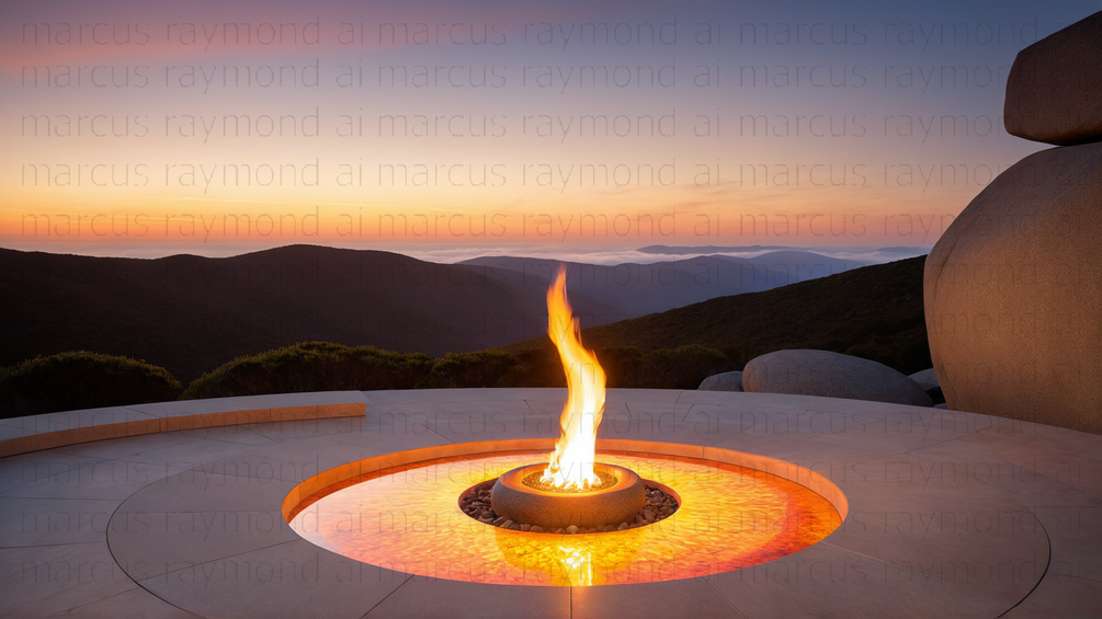 Discover the perfect addition to your digital collection with this stunning, royalty-free image titled Serene Fire Pit at Dusk. This beautiful scene features a glowing fire pit surrounded by elegant stonework, set against the backdrop of rolling mountains at dusk. The flickering flames cast a warm, inviting light, enhancing the smooth, light-coloured stone and creating a serene ambiance perfect for any project.